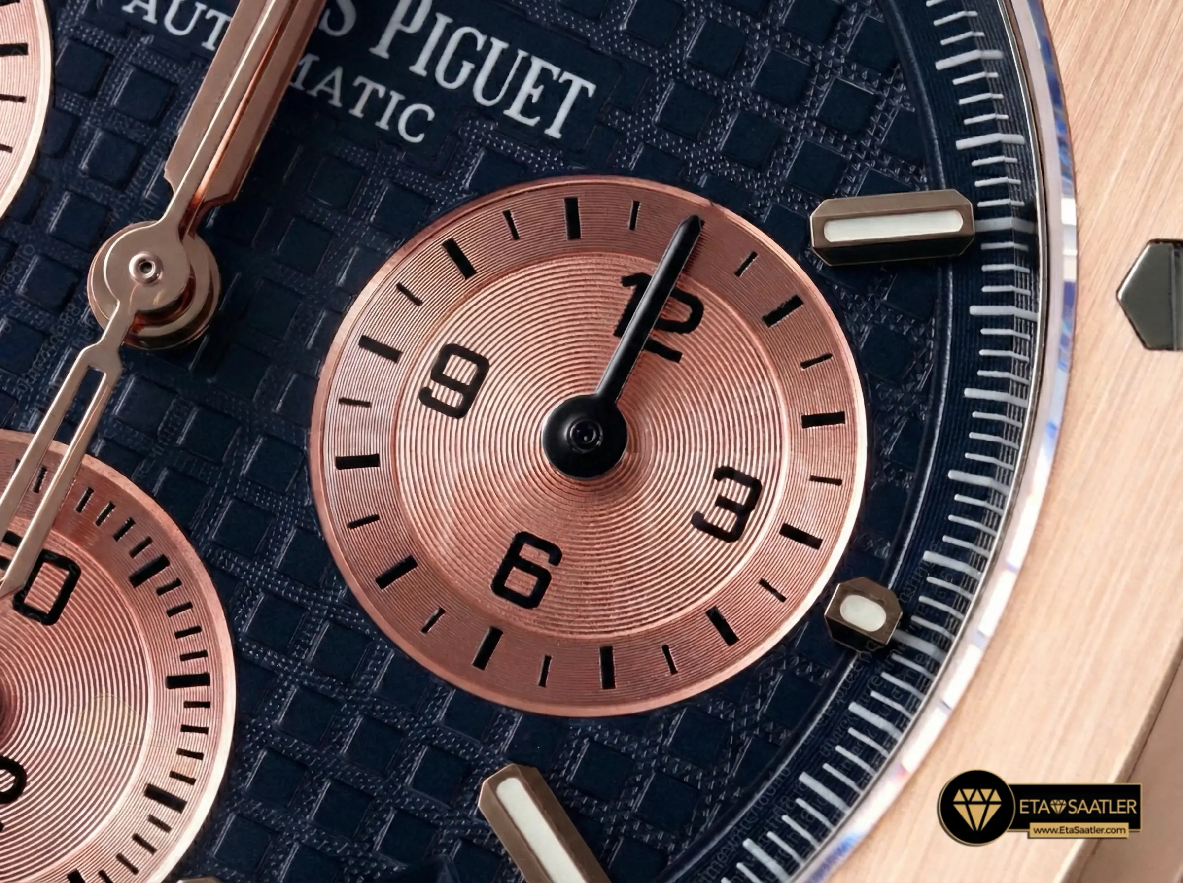 Saatin yüzü, ışıkla oyunlar oynayan mavi kareli (Grande Tapisserie) desene sahiptir. Rose Gold alt kadran halkaları, mavi zemin üzerinde lüks bir kontrast oluşturur. DDF Factory, kadran üzerindeki AP logosunu ve yazıları lazer teknolojisiyle 1:1 hassasiyette işlemiştir. Tarih penceresi, 4 eksenli lazer kesimle pürüzsüz ve üç boyutlu bir derinliğe kavuşturulmuştur; bu detaylar saatin genelindeki yüksek işçiliği kanıtlar.