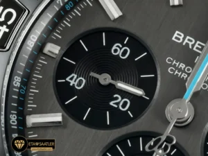 Breitling Süper Mekanik Zamanlayıcı 44mm Gri Kadran‘ın kadranı, bir kronograf için hayati önem taşıyan okunabilirliği ve sofistike estetiği bir araya getirir. Bu zarif **gri tonu**, saatin sportif yapısıyla çarpıcı bir denge oluşturarak, lüks ve geleneksel bir stil sunar. Kadranın en dikkat çekici detayı, saatin dinamik kimliğini vurgulayan **bebe mavisi saniye ibresidir**. Bu ince renk dokunuşu, kronograf ölçümlerini takip ederken gözü anında cezbeder ve kadranın genel asil tonuyla modern, yüksek kontrastlı bir uyum sağlar. Alt kadranların yerleşimi ve büyüklüğü, kronograf fonksiyonlarının kolayca takip edilmesini sağlar. Uygulanan saat imleri ve ibreler, Super-LumiNova ile cömertçe kaplanmıştır, bu sayede düşük ışık koşullarında bile mükemmel okunabilirlik sunar. Kadranı koruyan **kavisli (bombeli) safir kristal cam**, Breitling’in havacılık temasına uygun olarak **çift taraflı yansıma önleyici (AR) kaplamaya** sahiptir. Bu gri kadran, sadece zamanı değil, aynı zamanda kronometrik hassasiyetin ve rafine bir karakterin dinamizmini yansıtır.