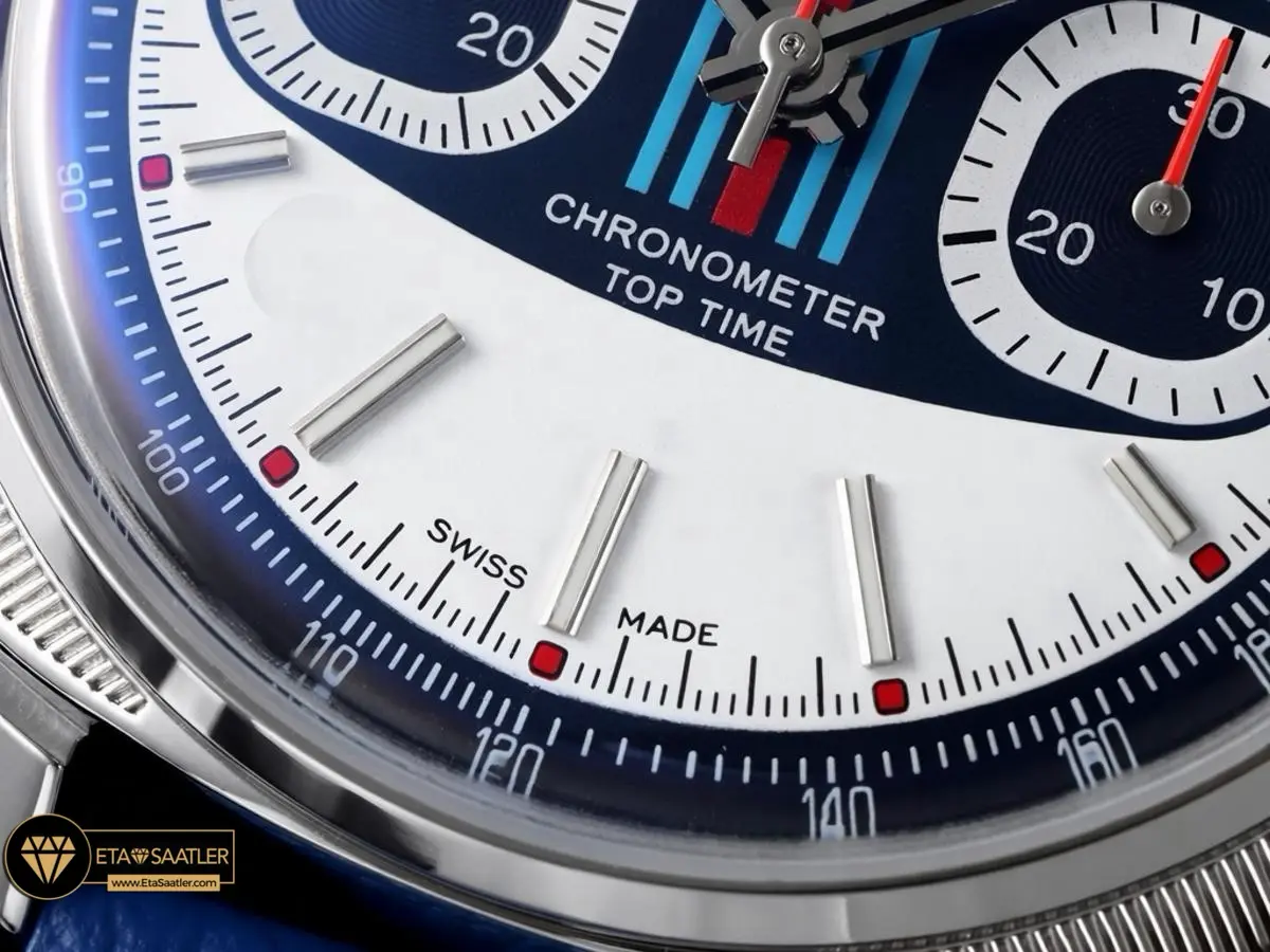 Breitling’in genellikle büyük kasalı saatlerle anılan imajı, BLS Factory‘nin sunduğu bu yepyeni Top Time Racing modeliyle zarif bir değişime uğruyor. Özellikle ince bilekli saat tutkunlarının uzun zamandır beklediği 38mm kasa çapına sahip bu model, retro motor sporlarının heyecanını bileğinize taşıyor. Beyaz zemin üzerindeki mavi blok ve ikonik yarış çizgileriyle (mavi, açık mavi ve kırmızı) dikkat çeken bu versiyon, sportif şıklığı vintage bir karakterle harmanlıyor.