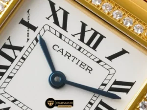 Saf beyaz kadranın üzerinde yer alan siyah Roma rakamları, Cartier’e özgü şıklığı yansıtıyor. Kılıç formundaki mavi çelik saat ibreleri, göze çarpan ama sade bir detay sunuyor.