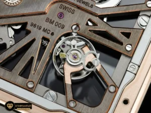Saatin kalbinde, tüm detaylarıyla şeffaf bir seyir zevki sunan 1:1 9611MC manuel (elden kurmalı) mekanizma yer almaktadır. Romen rakamı şeklinde tasarlanan köprüler, pembe altının zenginliğiyle birleşerek kadranı adeta kinetik bir heykele dönüştürür. Bu sıcak tonların içinde öne çıkan kılıç formundaki ibreler, hem yüksek okunabilirlik sağlar hem de tasarıma asil bir bütünlük katar.