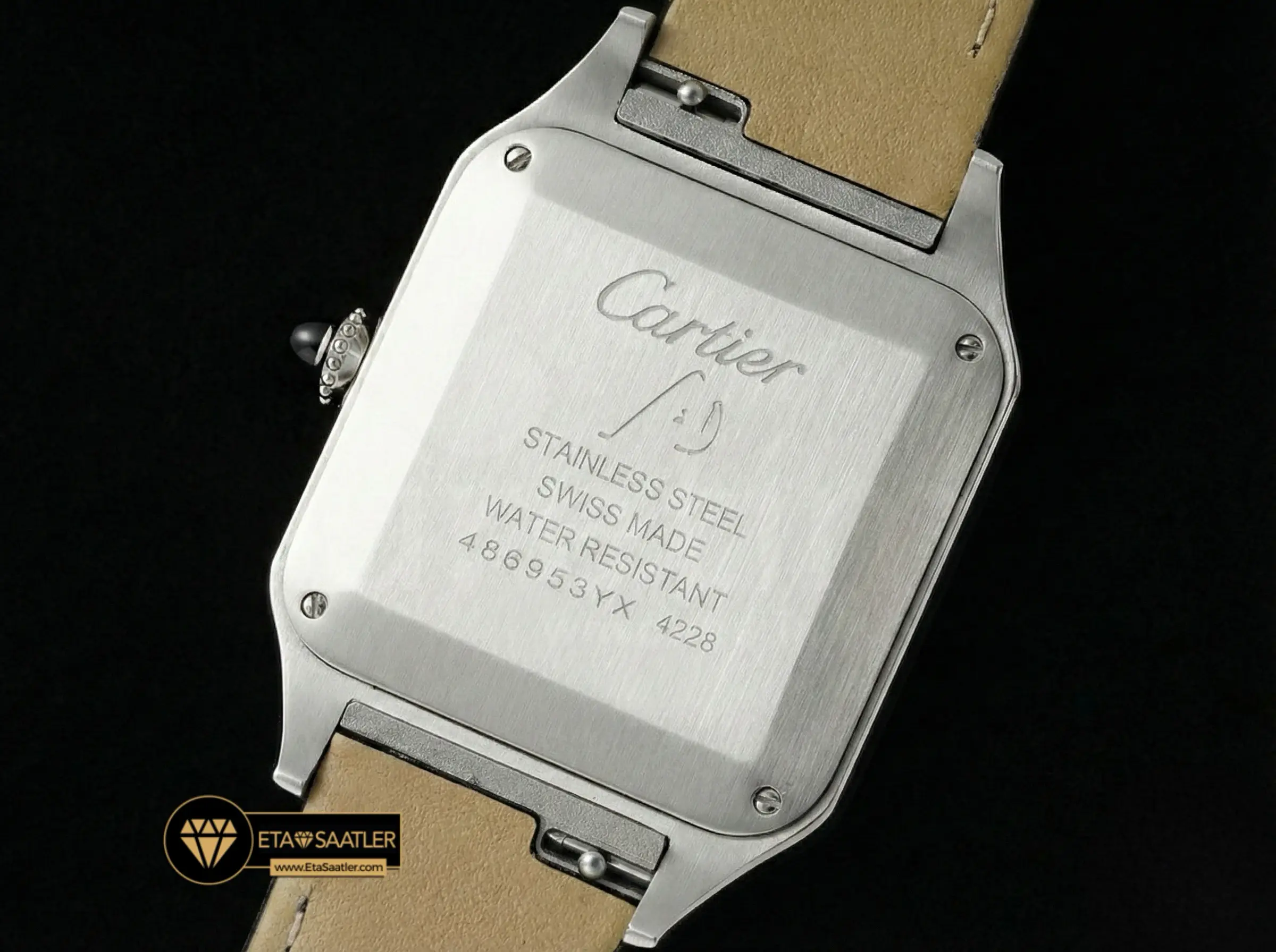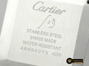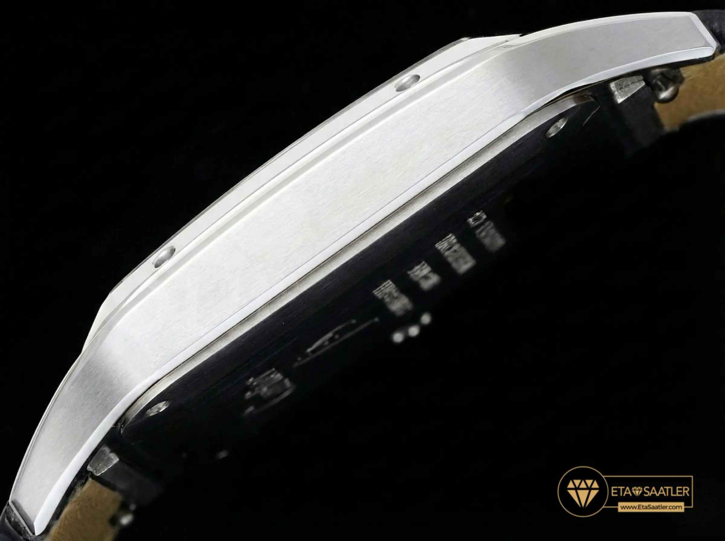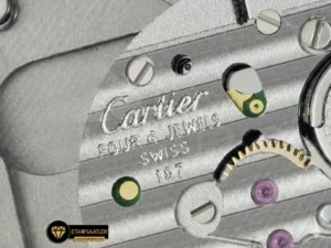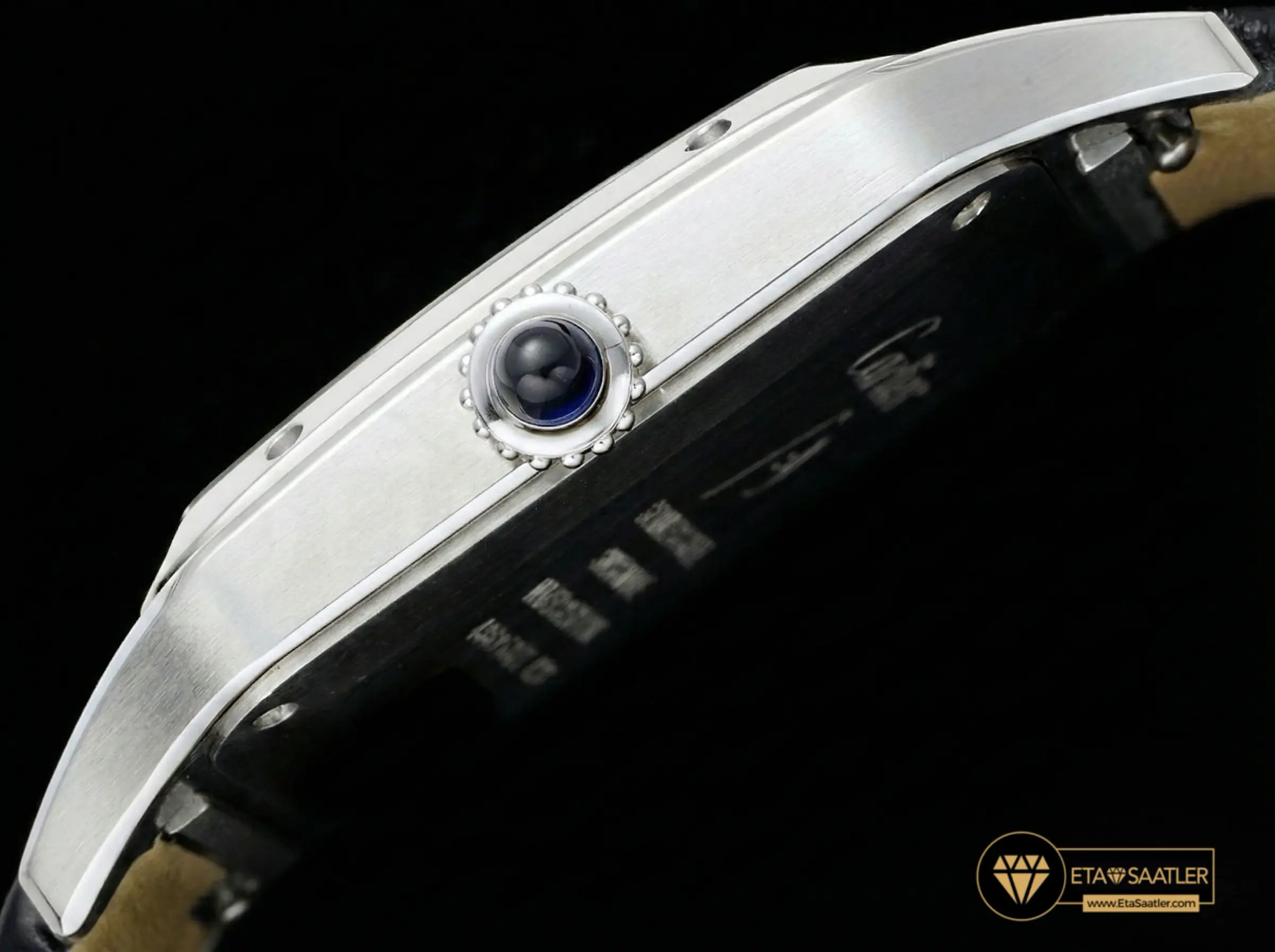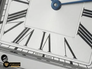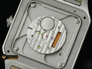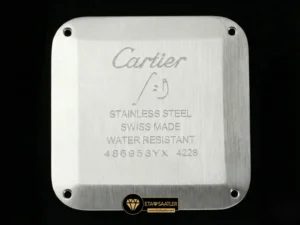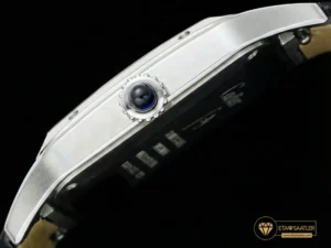 Saatin kasası, paslanmaz çelikten üretilmiş olup, Santos’un imzası olan görünen vidalar ve yuvarlatılmış köşelerle donatılmıştır. Kasa yüzeyindeki saten fırçalama (satin-finish) işlemi, saate mat ve asil bir parlaklık kazandırır. AF Factory, kasanın inceliğini orijinal ölçülerde tutarak gömlek manşeti altında rahatça taşınabilmesini sağlamıştır. Kurma kolundaki boncuklu yapı ve mavi sentetik kabaşon taşı, markanın mirasını yansıtan en önemli detaydır.