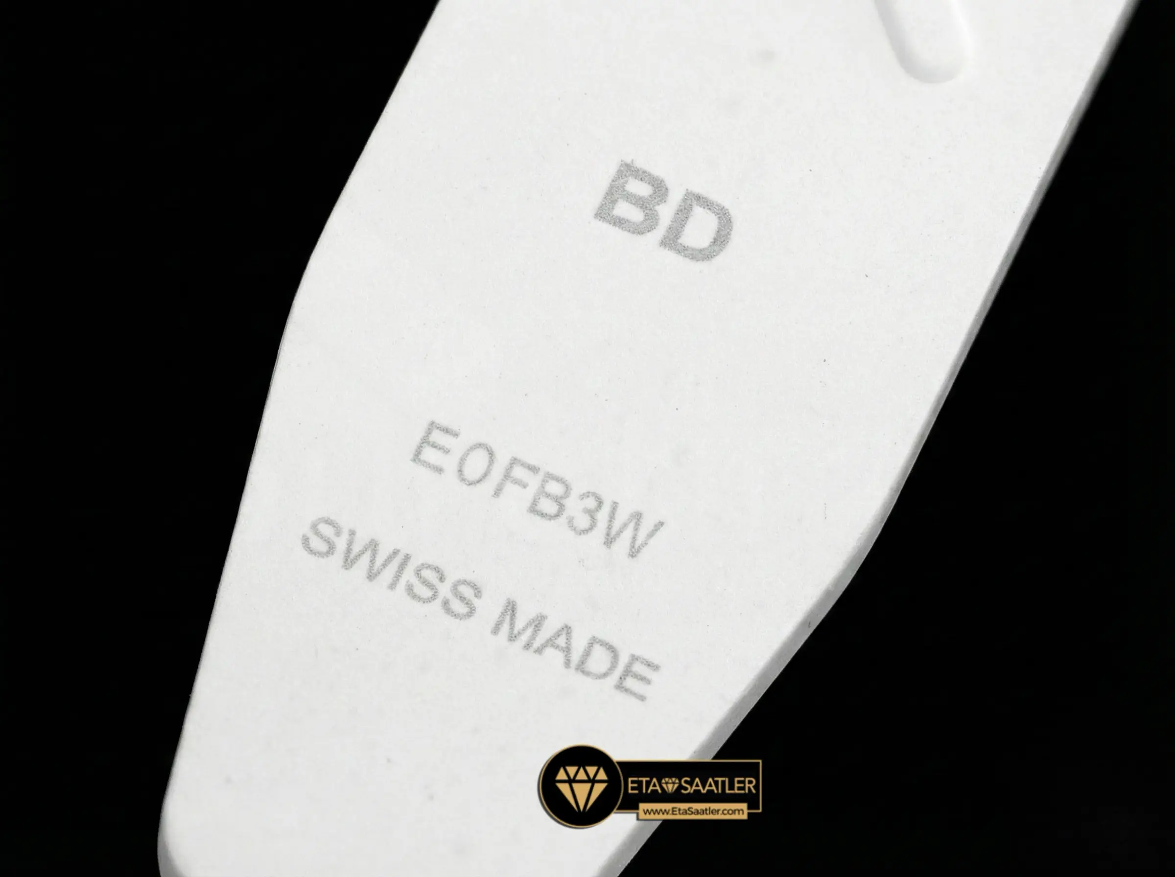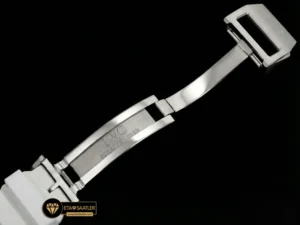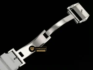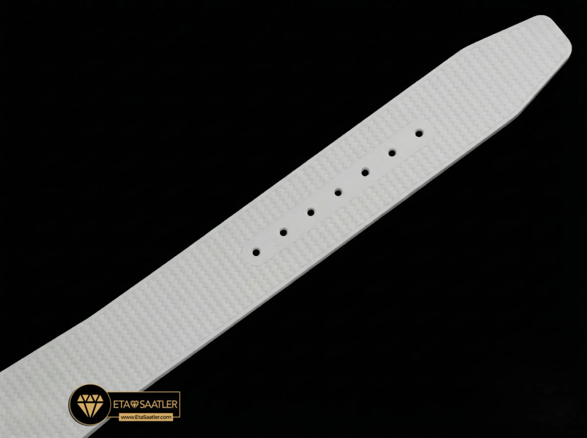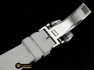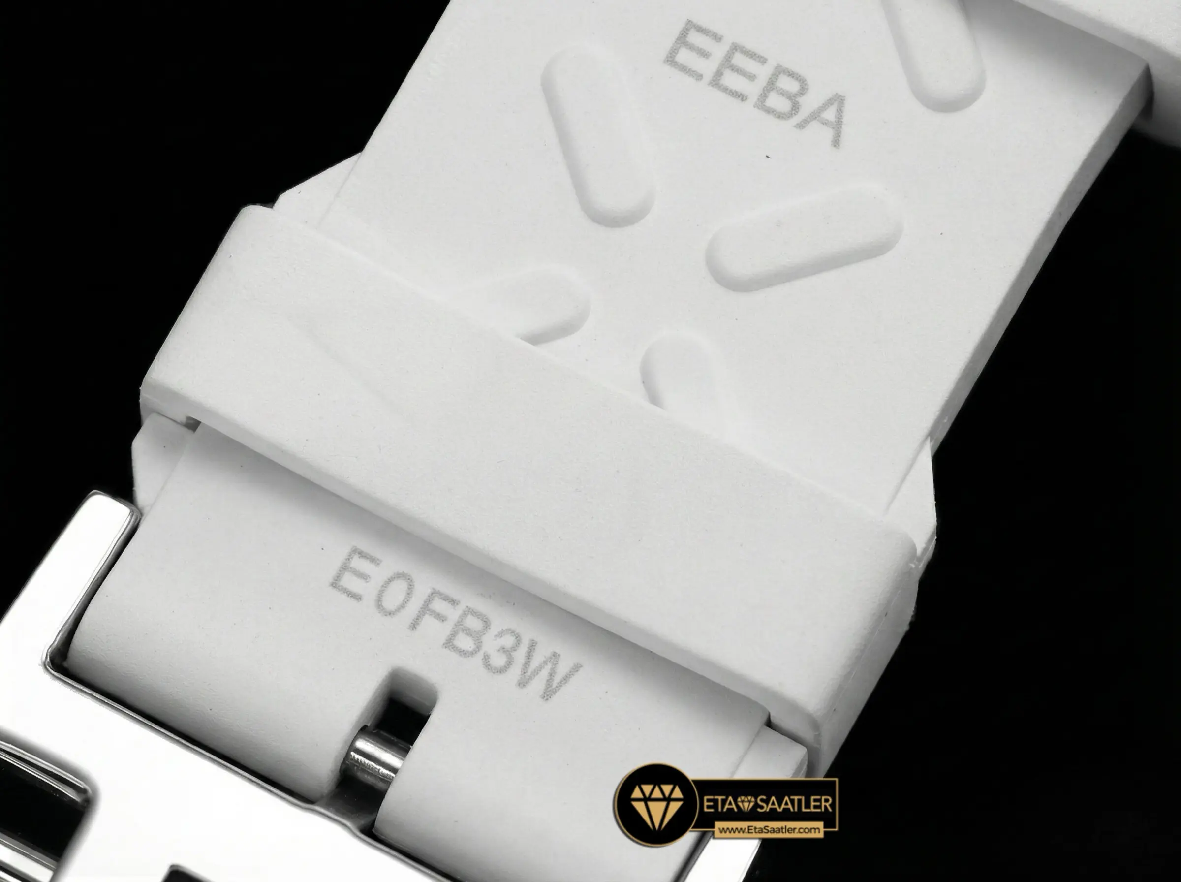 Modelin bütünlüğünü sağlayan en önemli unsur, kasayla birebir renk uyumuna sahip beyaz kauçuk kayışıdır. Yüksek kaliteli malzemeden üretilen bu kayış, esnek yapısı sayesinde bileği mükemmel kavrar ve gün boyu konfor sunar. Kayışın üzerindeki dokulu yüzey, saatin sportif karakterini vurgularken, katlanır toka (deployant clasp) sistemi güvenli ve pratik bir kullanım sağlar. Beyaz rengin saflığı, saatin genelindeki kış temasıyla eşsiz bir uyum içindedir.