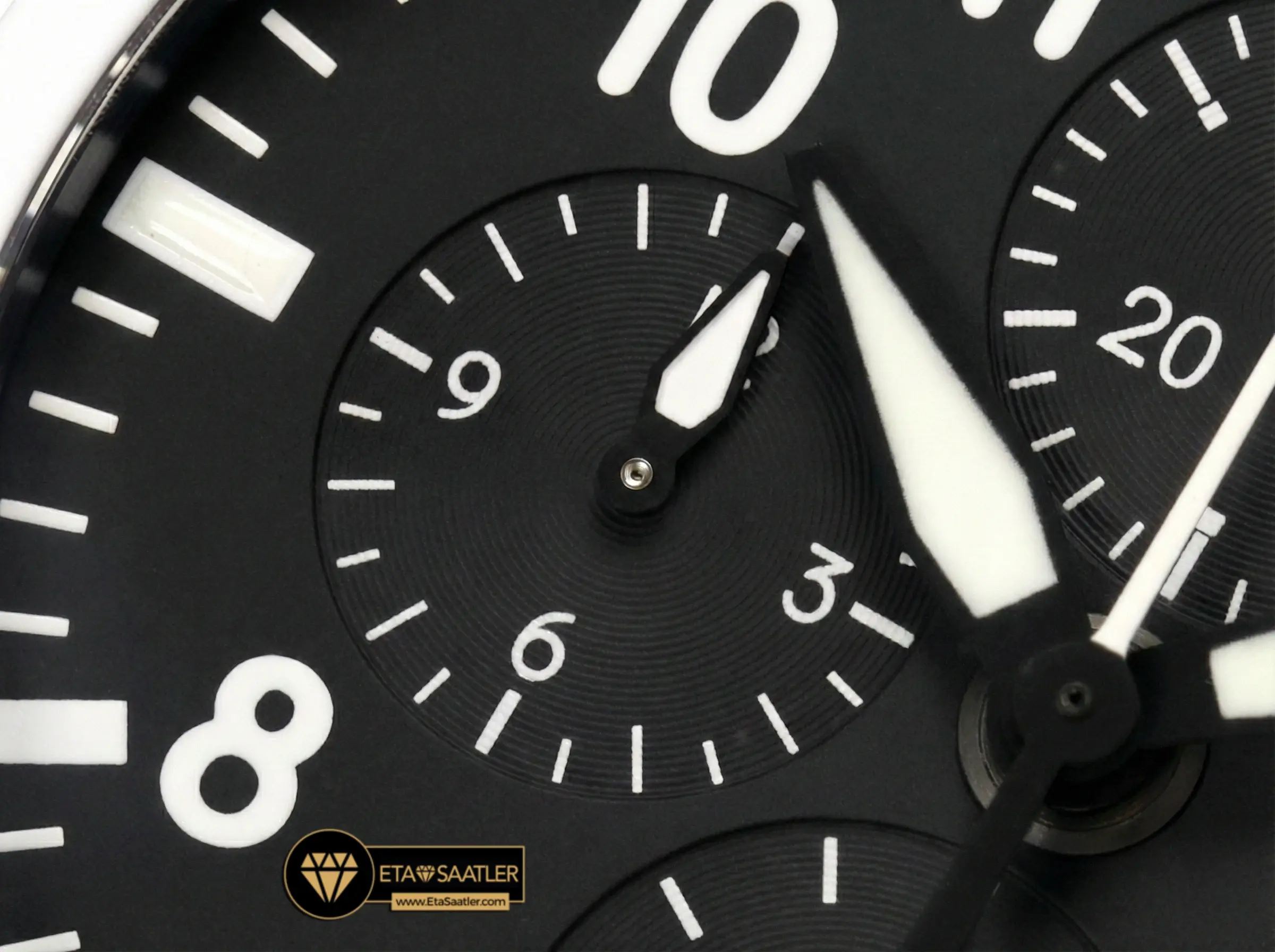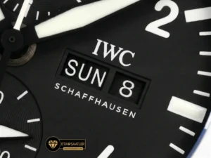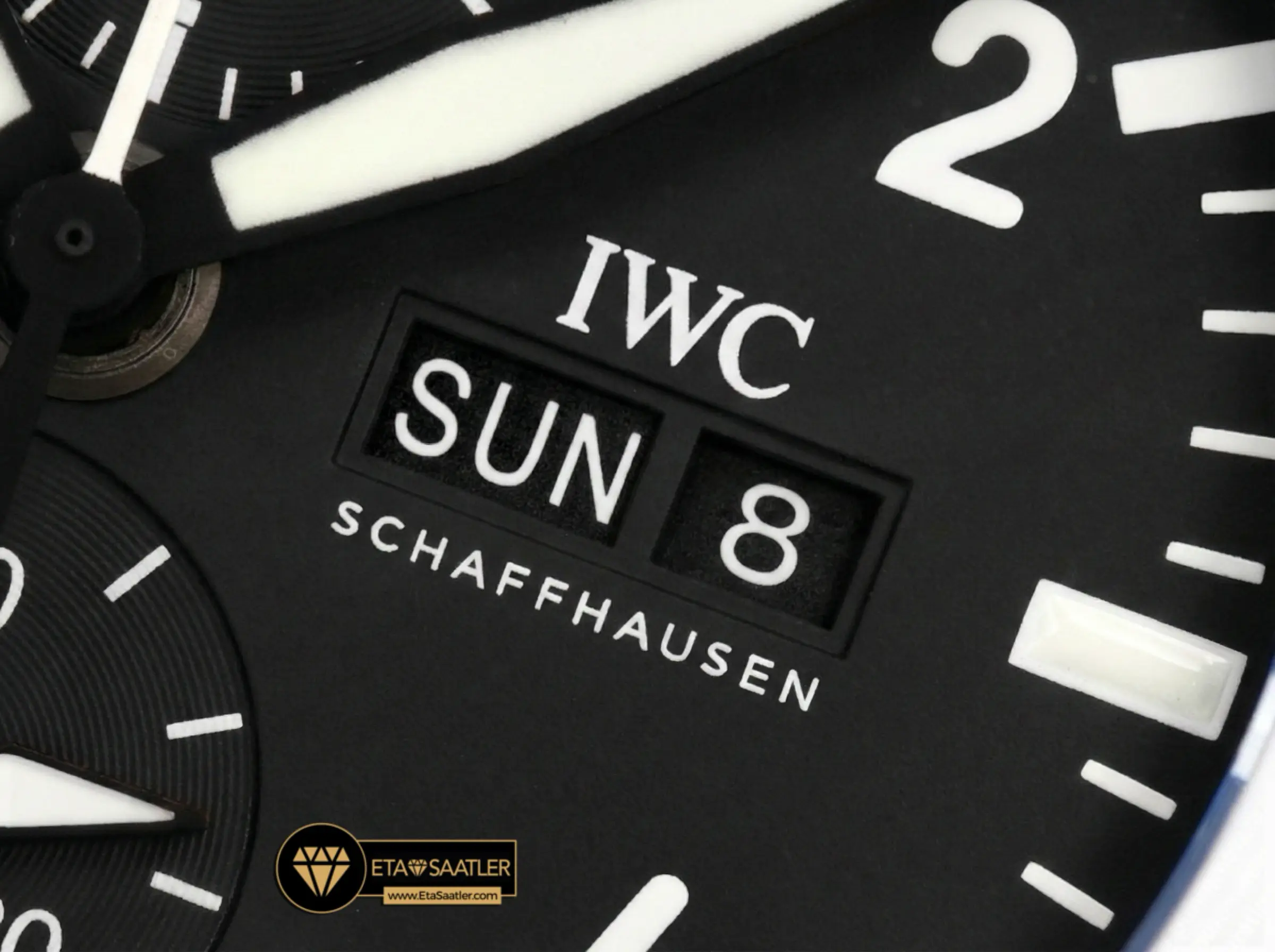 Saatin yüzü, beyaz kasanın aksine derin mat siyah kadran ile tasarlanmıştır. Bu zıtlık, pilot saatlerinin vazgeçilmezi olan okunabilirliği en üst seviyeye taşır. Siyah zemin üzerindeki beyaz ibreler ve indeksler, lüminesans kaplaması sayesinde her türlü ışık koşulunda net bir görüş sağlar. Saat 3 yönündeki gün ve tarih penceresi ile kronograf alt kadranları, işlevselliği estetikle buluşturur. Kadrandaki her detay, IWC’nin fonksiyonel tasarım anlayışını APS Factory hassasiyetiyle yansıtır.