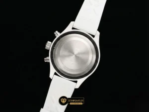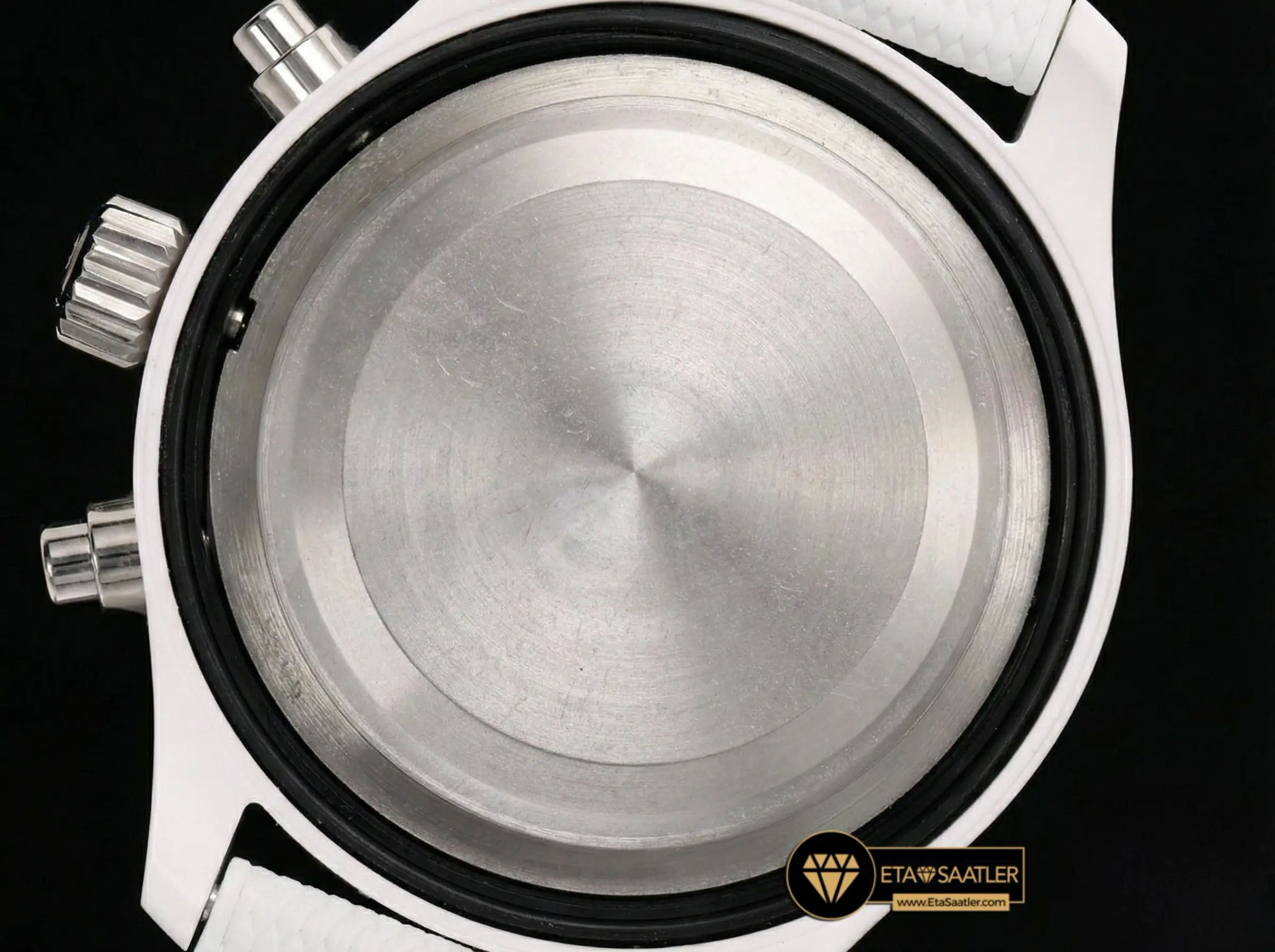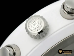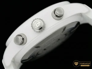 Bu modelin en çarpıcı özelliği, Lake Tahoe konseptine hayat veren beyaz seramik kasasıdır. APS Factory, seramiğin sertliğini ve pürüzsüzlüğünü mükemmel bir işçilikle birleştirerek, çizilmelere karşı ultra dirençli ve zamanla rengini kaybetmeyen bir gövde ortaya çıkarmıştır. 44.5 mm çapındaki bu beyaz kasa, mat siyah kadran ve butonlarla güçlü bir kontrast oluşturur. Arka kapak, Top Gun serisinin ruhunu yansıtan detaylarla işlenmiş olup, saatin profesyonel kimliğini tamamlar. Beyaz seramiğin hafifliği ve dayanıklılığı, saati bilekte konforlu bir zırh gibi hissettirir.
