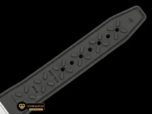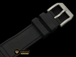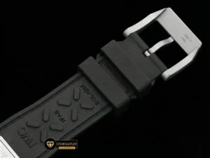 IWC Pilot’s Watch Chronograph, havacılık standartlarına uygun, yüksek kaliteli siyah mikro gözenekli kauçuk kayış ile tamamlanmıştır. Bu kayış yapısı, terlemeye ve dış etkenlere karşı son derece dirençli olmasının yanı sıra bileği yumuşak bir şekilde kavrayarak maksimum ergonomi sağlar. Kayışın dokusu, saatin askeri ve profesyonel kimliğini pekiştirirken, sağlam kilit sistemi güvenli bir kullanım vaat eder. Hem sportif aktivitelerde hem de günlük yaşamda konforundan ödün vermeyenler için bu kordon yapısı, ideal bir denge oluşturur.