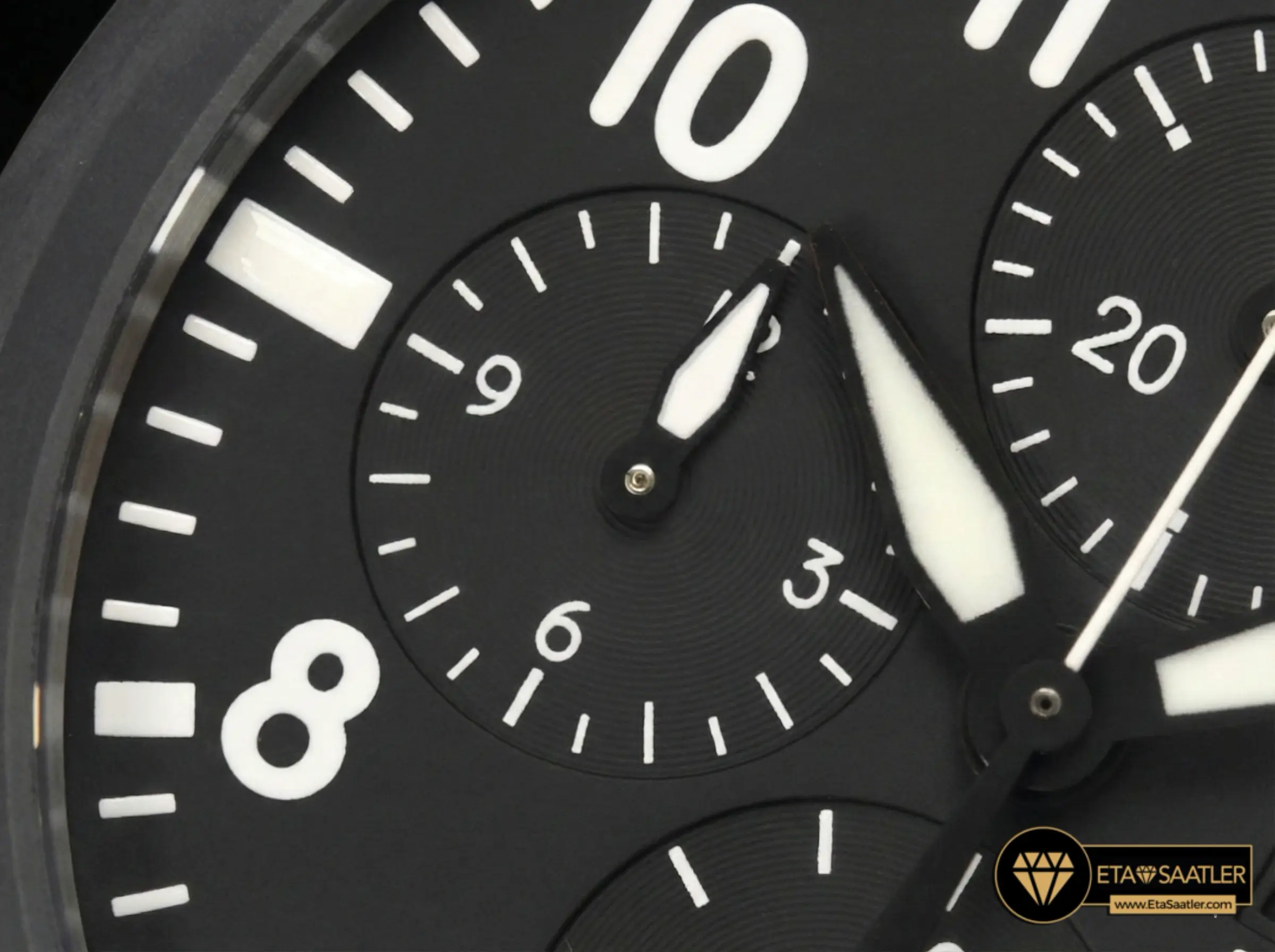 Kadran tasarımı, bir pilot saatinin en kritik özelliği olan maksimum okunabilirlik ilkesiyle şekillendirilmiştir. Mat siyah zemin üzerine yerleştirilen beyaz rakamlar ve ibreler, her ışık koşulunda zamanın net bir şekilde takip edilmesini sağlar. Saat 3 konumunda yer alan gün ve tarih göstergesi ile kronograf alt kadranları, kadrana işlevsel bir derinlik katar. APS Factory tarafından özenle hazırlanan kadranda, işaretçiler ve ibreler yüksek kaliteli lüminesans ile desteklenerek gece uçuşlarında bile kusursuz görünürlük sunar. Kırmızı detaylı küçük saniye ibresi, kadrana sportif bir hareketlilik katar.