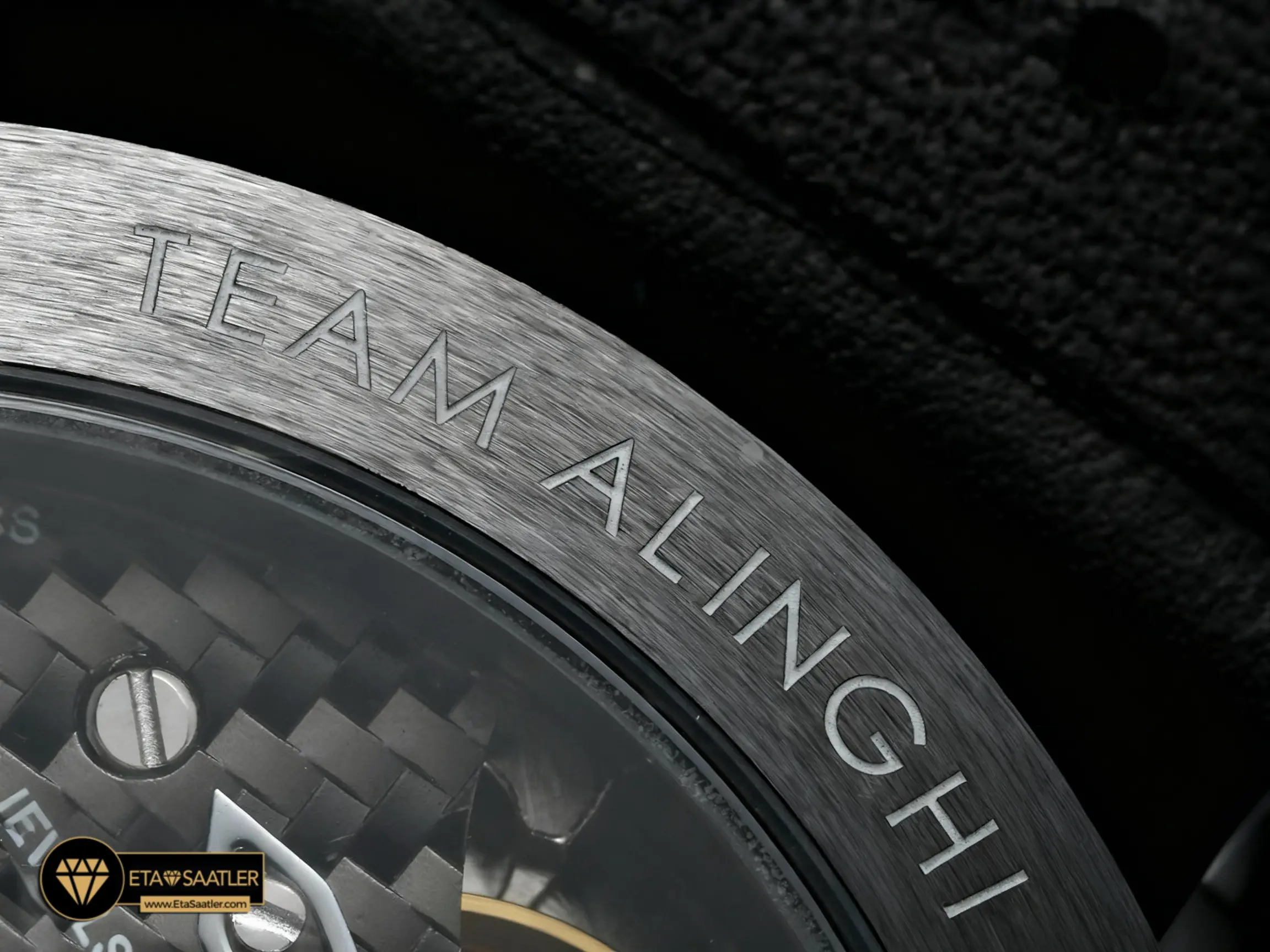 Siyah eloksallı alüminyumdan üretilen iskelet kadran, saatin tüm mekanik ihtişamını ve ay yüzeyi dokusunu gözler önüne seriyor. Kadranın en ikonik parçası olan küçük saniye ibresi, 5. derece titanyumdan imal edilmiş ve efsanevi Saturn V roketinin 3D formuna sahiptir. Lazer torna ve siyahlaştırma teknikleriyle aslına uygun şekilde renklendirilen bu roket figürü, her bakışta ayrı bir detay keşfetmenizi sağlar. Alinghi Team ruhuna atıfta bulunan sarı vernikli merkezi kronograf saniye ibresi, kadranın karanlık temasını dinamik bir enerjiyle tamamlayarak okunabilirliği zirveye taşır.