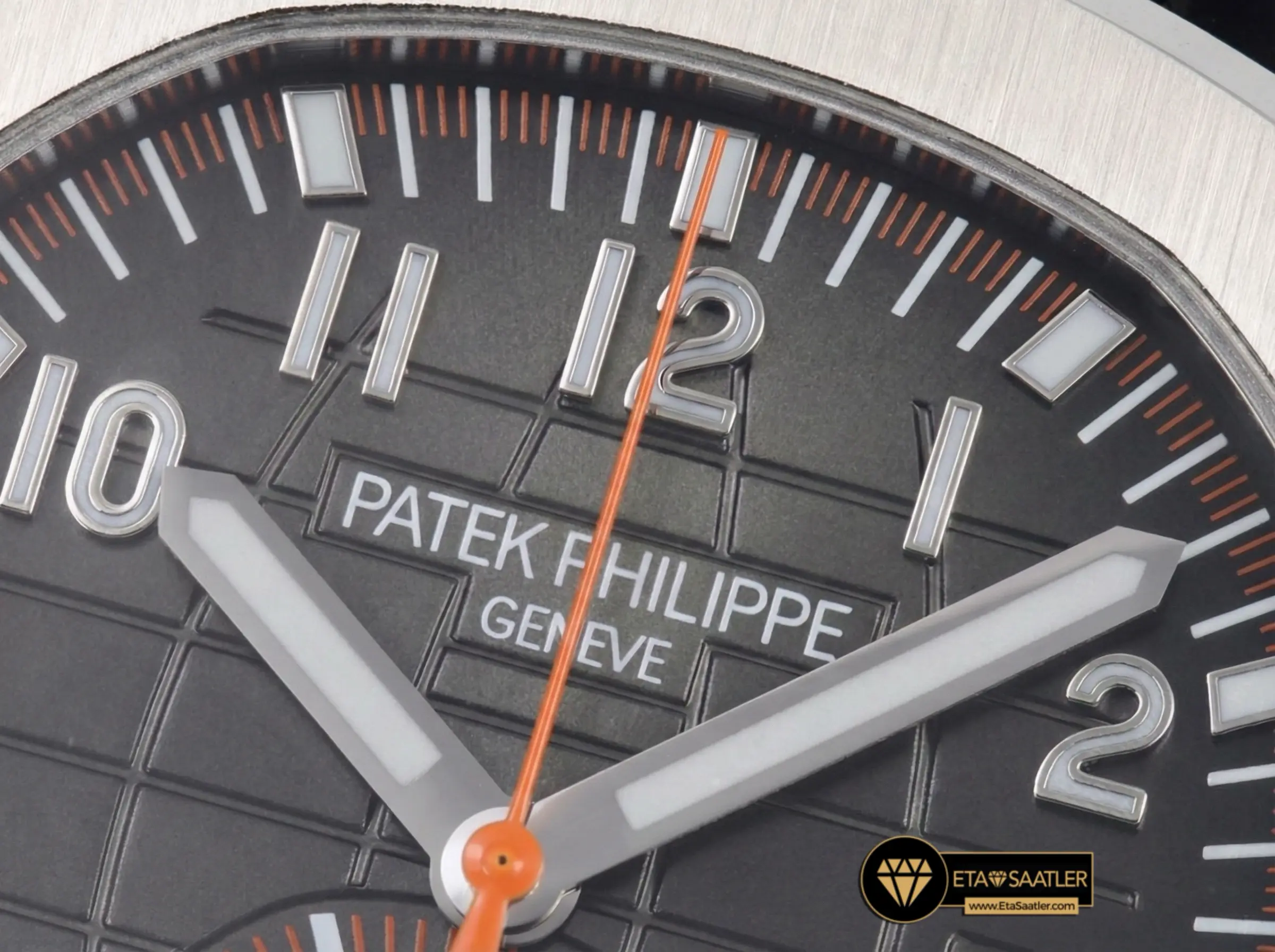 Modelin yüzü, Aquanaut serisinin imzası olan siyah kabartmalı (embossed) desenle işlenmiştir. Bu derin siyah zemin üzerinde parlayan turuncu kronograf saniye ibresi ve indeks detayları, saate dinamik bir enerji katar. Tarih penceresindeki rakam fontları, P1 Factory tarafından orijinaline birebir sadık kalınarak hazırlanmış olup, kadran bütünlüğünü kusursuz bir şekilde tamamlar. Okunabilirlik ve estetik, bu kadranda mükemmel bir dengeyle buluşur.