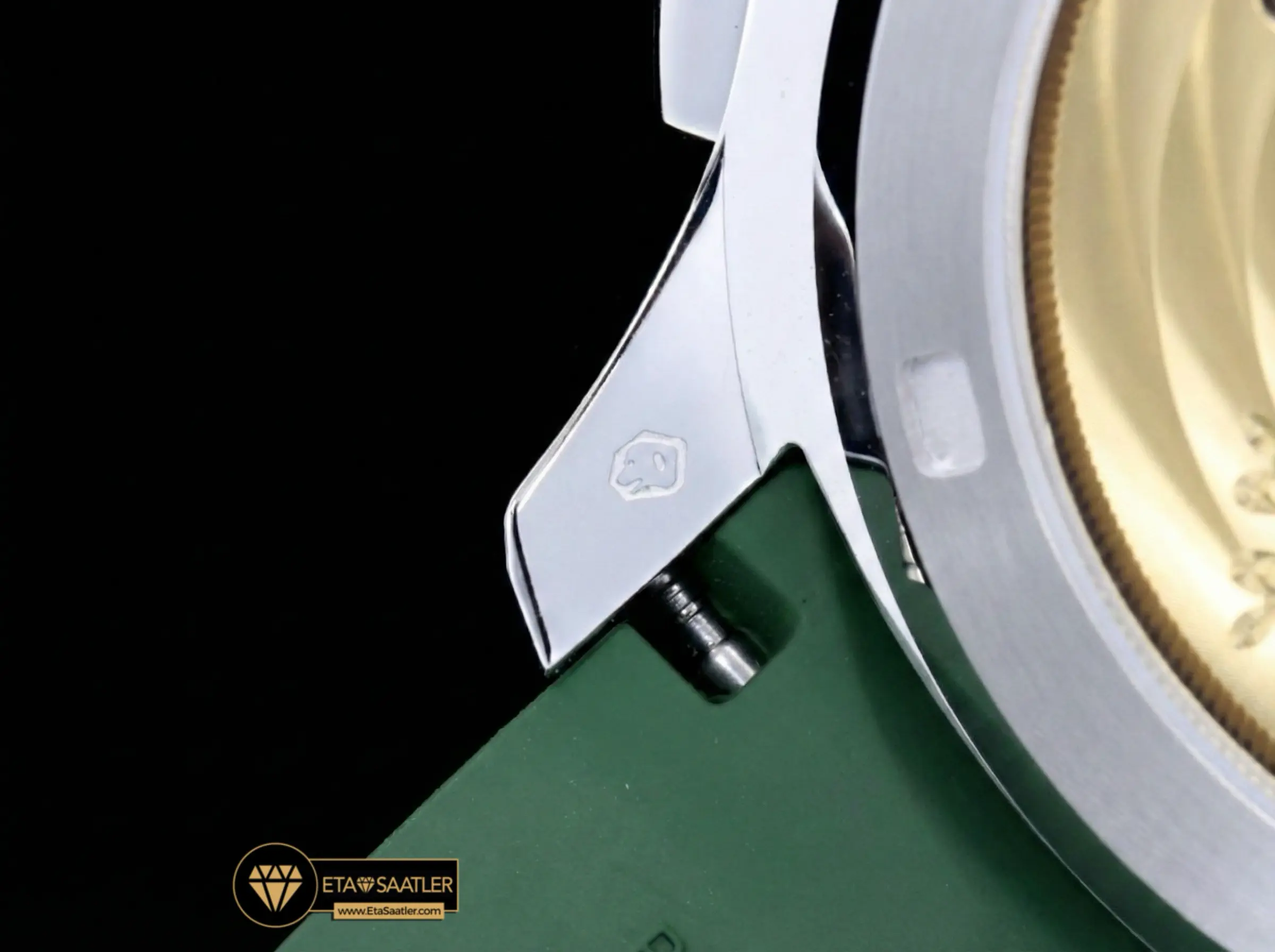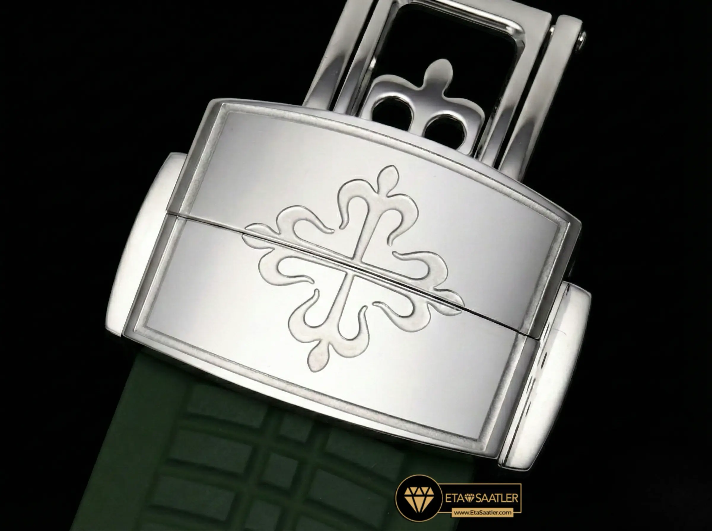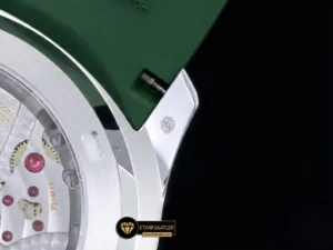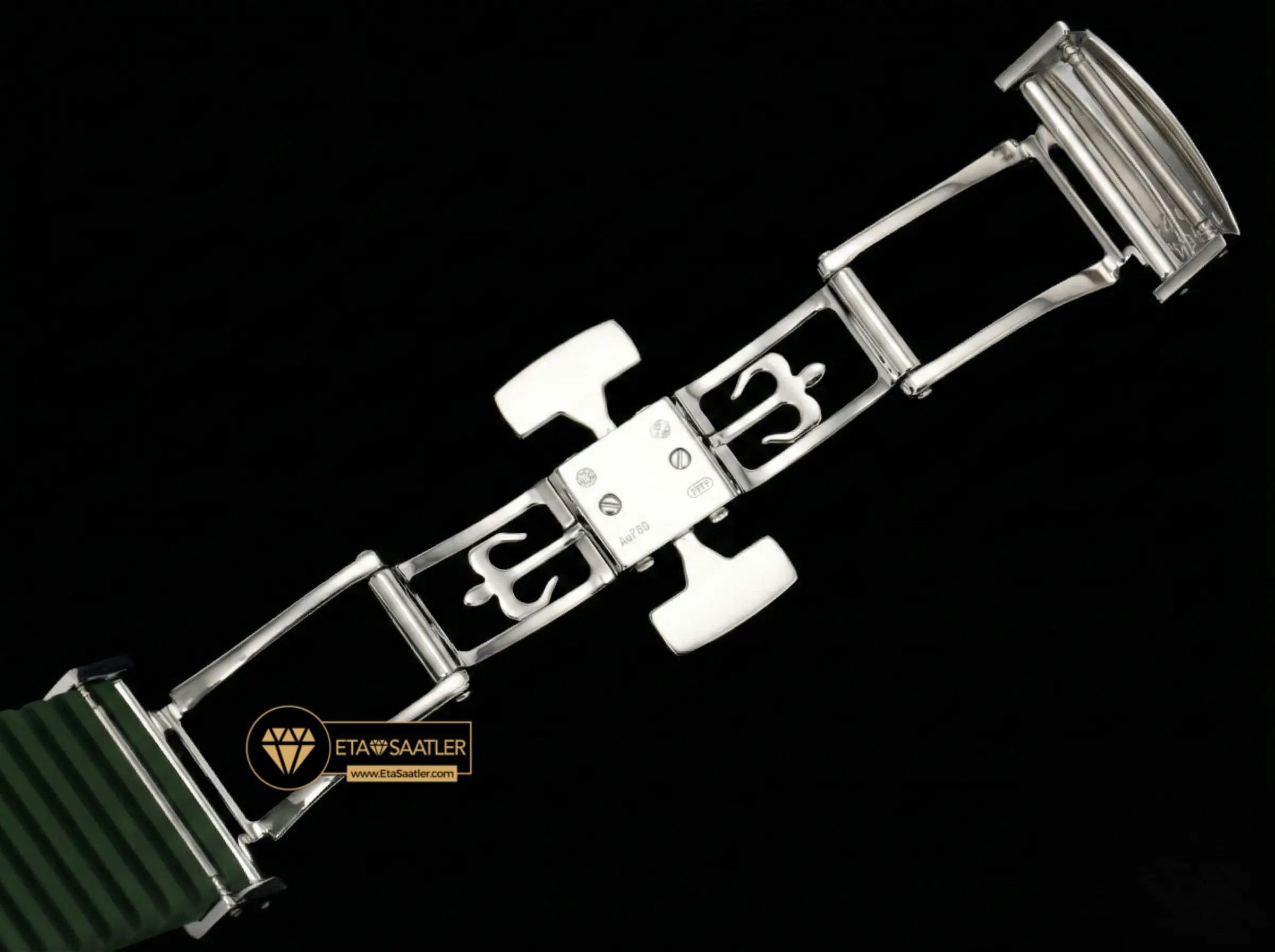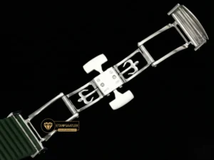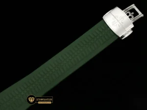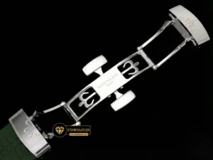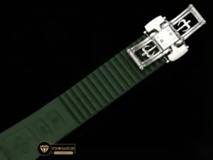 Kasa ve kadranla mükemmel bir bütünlük sağlayan haki yeşil kompozit kauçuk kayış, bu modelin en güçlü stil öğesidir. Suya, aşınmaya ve UV ışınlarına dayanıklı olan bu kayış, bileği konforlu bir şekilde sarar. Kayışın ucundaki katlanır toka da kasayla aynı şekilde beyaz altın kaplama işlemine tabi tutulmuş olup, parlaklığıyla dikkat çeker. Hem şehirde hem de doğada kullanım için ideal bir yapı sunar.
