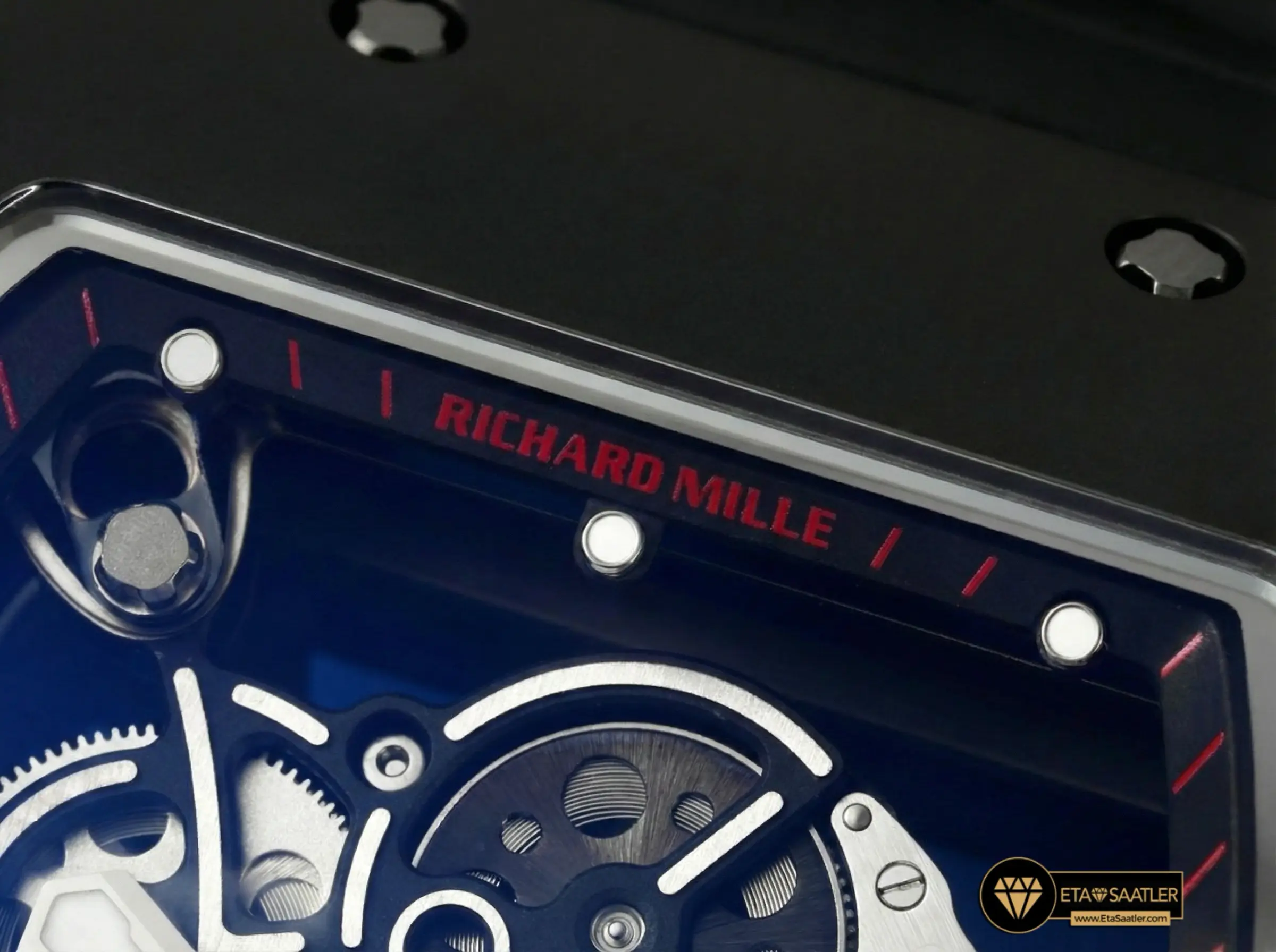 Richard Mille RM 055‘in kadranı, geleneksel bir yüzeyden çok, saatin iskelet mekanizmasının kendisidir. Bu tam **iskelet (skeletal)** tasarım, mekanizmanın tüm karmaşık bileşenlerinin ön ve arka safir camlardan serbestçe görülmesini sağlar. İskelet mekanizmanın bazı köprüleri ve çerçeve detayları **rose gold (pembe altın) tonlarında** işlenmiştir; bu, siyah ve beyaz seramik kasayla lüks bir kontrast oluşturur. Kadranın en dikkat çekici detayları, saatin spor kimliğini vurgulayan **kırmızı renkteki dakika/saniye indeks çizgileri**, net bir şekilde yazılmış **kırmızı RICHARD MILLE logosu** ve **kırmızı SWISS MADE** yazısıdır. Bu kırmızı dokunuşlar, siyah-beyaz çerçeve ve altın mekanizma kombinasyonuna dinamik bir enerji katarken, okunabilirliği de artırır. Saatin ön yüzeyini koruyan **ultra şeffaf safir kristal cam**, iskelet mekanizmanın tüm detaylarının her açıda net bir şekilde algılanmasını sağlar.