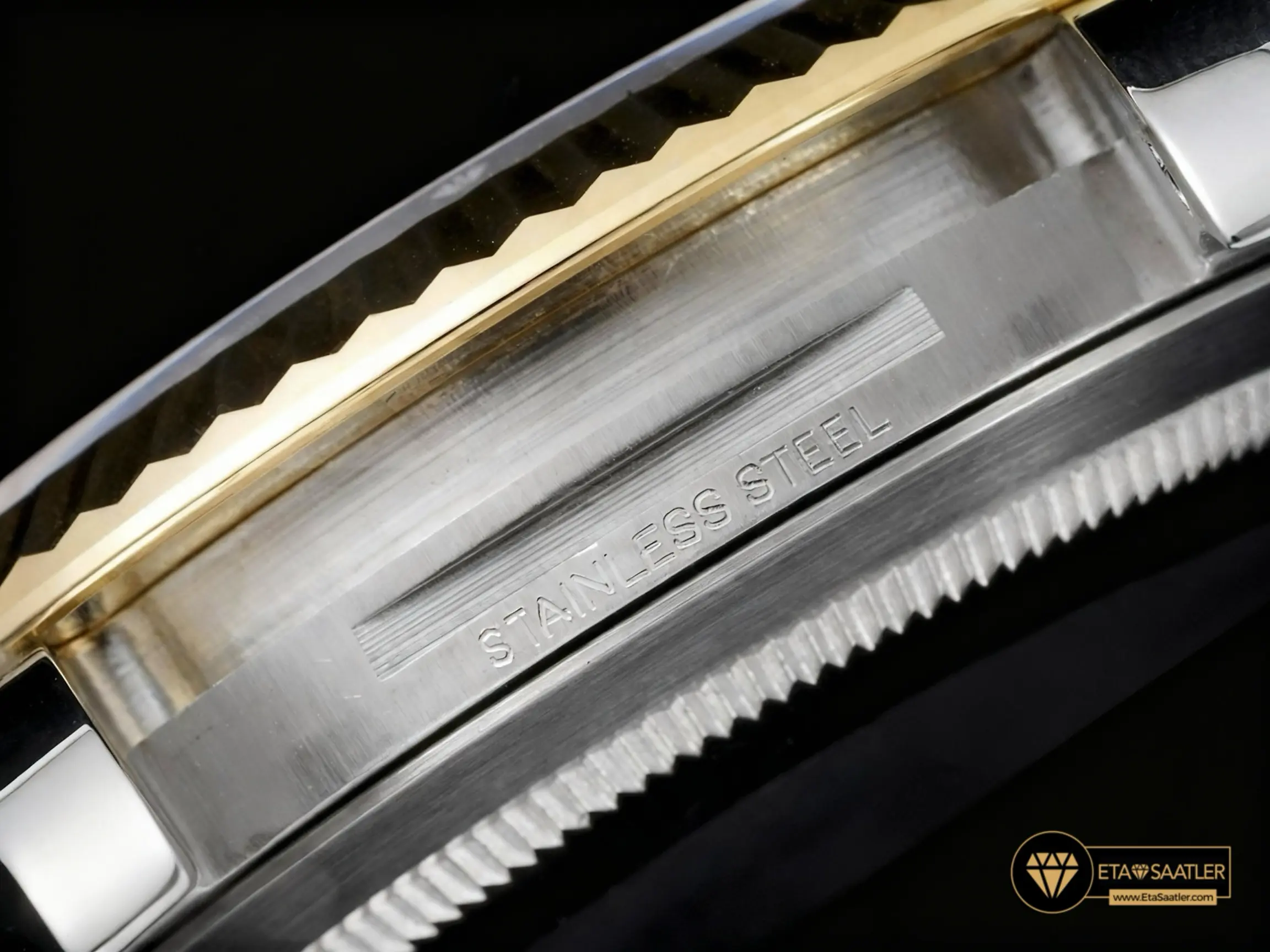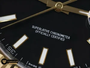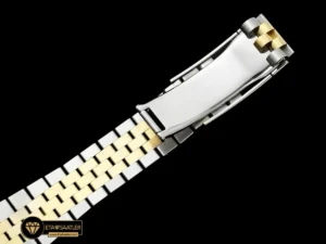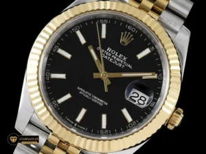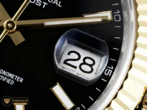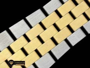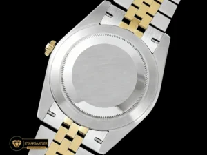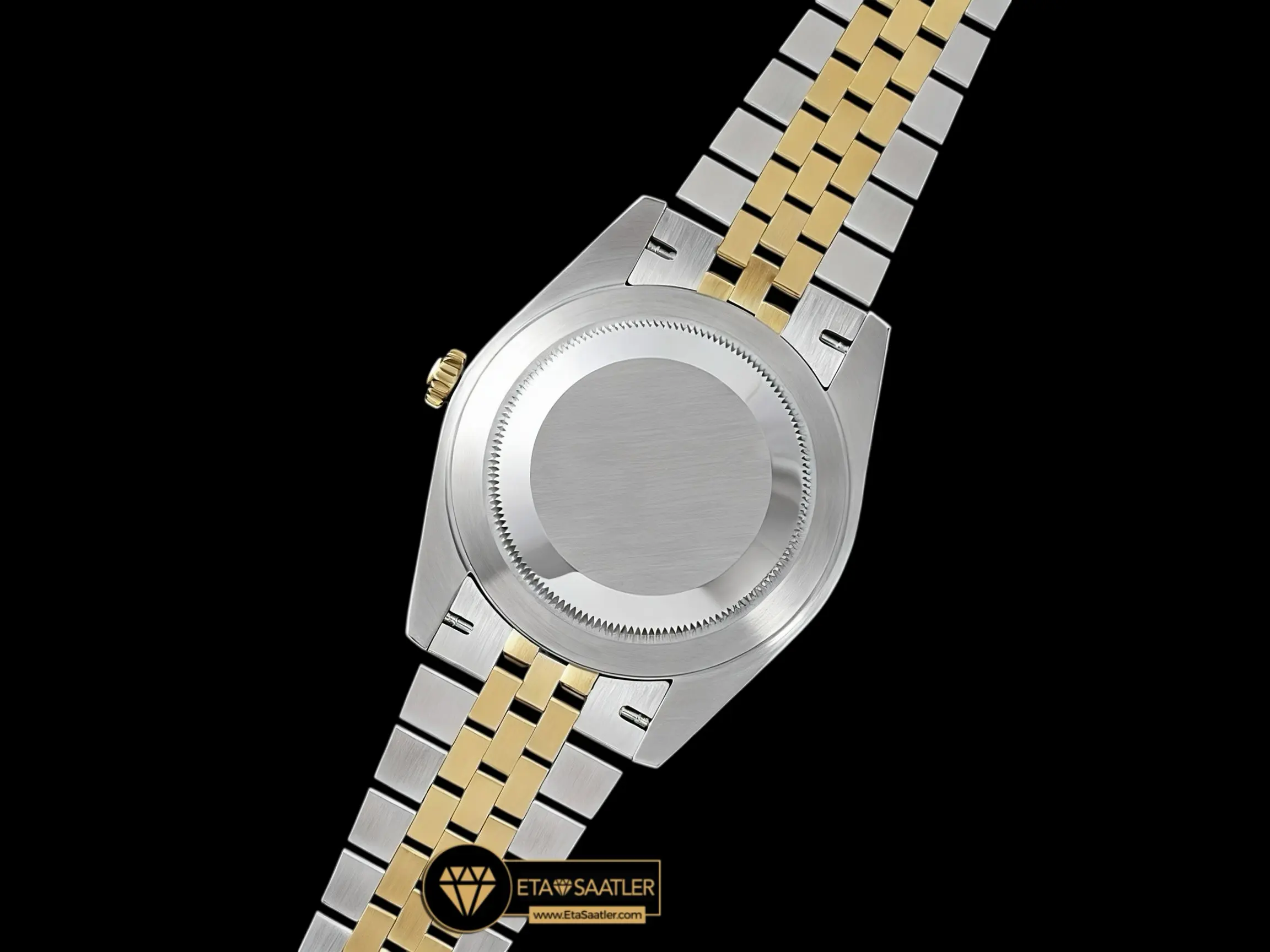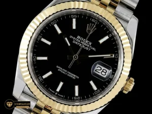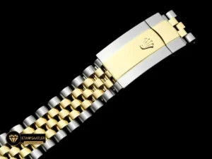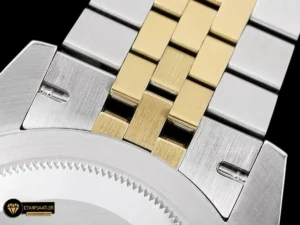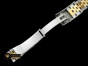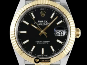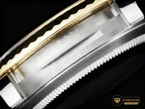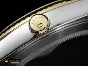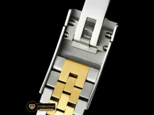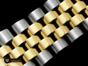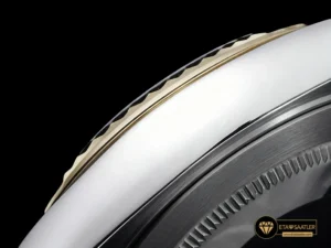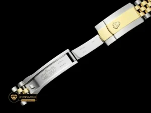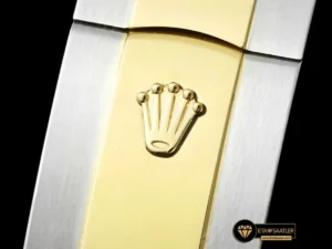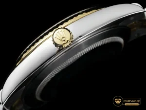 Rolex Datejust 126333 Siyah Kadran‘ın kasası, Rolex’in en popüler materyali olan Rolesor estetiğini yansıtan, Oystersteel ve **yüksek micron altın kaplamanın** zarif bir birleşimidir. 41mm’lik ideal kasa çapı, modern bir saat beklentisini karşılar ve bilekte güçlü ama dengeli bir varlık hissi yaratır. Kasanın yüzeylerindeki özenli saten fırçalanmış ve cilalı bitişlerin ustaca geçişleri, çeliğin sağlamlığını ve altının sıcak ışıltısını sergiler. Bu modelin en belirgin özelliklerinden biri olan **yivli (fluted) bezeli**, ustalıkla uygulanmış **yüksek micron altın kaplamaya** sahiptir ve her harekette ışığı yansıtarak saatin göz alıcı bir parlaklık kazanmasını sağlar. Yivli bezel, Rolex’in ayırt edici özelliklerinden biri olup, markanın klasiğini ve lüksünü temsil eder. Triplock kurma kolu sistemi, saatin su geçirmezliğini garanti altına alırken, kasanın sağlamlığı ve ergonomik yapısı, günlük kullanımda maksimum konfor sunar. VSF Factory‘nin bu kasadaki işçiliği, orijinalindeki Rolesor oranlarını, malzeme bitişlerini ve yivli bezelin kusursuz parlaklığını birebir yansıtır.