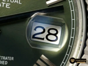 Saatin en büyüleyici kısmı, ışığın açısına göre ton değiştiren Zeytin Yeşili (Olive Green) kadranıdır. VS Factory, bu kadranda orijinalindeki gibi ipeksi ve kadifemsi (velvet-like) bir güneş ışını efekti yakalamıştır; bu da piyasadaki granüllü ve mat yeşil kadranlardan çok daha canlı ve net görünür. Kadran üzerine yerleştirilen keskin hatlı Romen rakamları, modele klasik ve sofistike bir hava katarken, saat 12 ve 3 yönündeki pencereler takvimi net bir şekilde sunar.