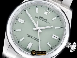 Minimalist tasarımı lüks detaylarla birleştiren Rolex Oyster Perpetual 126000, pistachio yeşili kadranıyla dikkat çeken özel bir superclone modelidir.